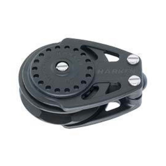 Harken 2633 57mm Carbo Ratchamatic Cheek Block. The Carbo Ratchmatic is a load sensing ratchet block that rolls freely in both directions under low loads and automatically engages the ratchet as loads increase. Shifting between ratchet and light air modes is seamless. unloaded main and jib sheets run out freely during mark roundings and asymmetrical spinnakers free instantly during jibes.
