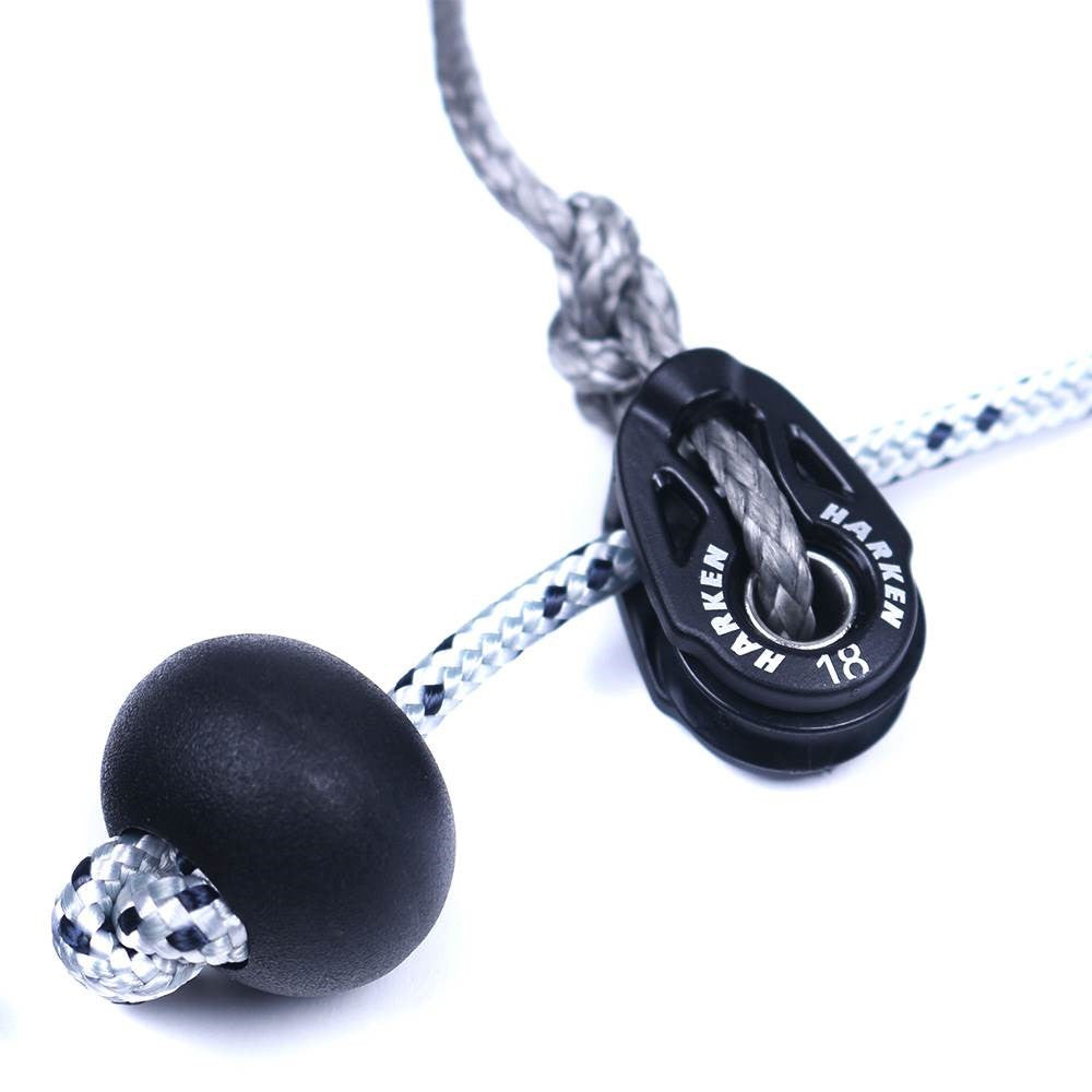 4:1 HARKEN outhaul, all the ropes and blocks, but with NO boom plate and cleat. This outhaul uses a 2mm dia. dyneema Rooster Spectweleve grey) rope where we can, and a 4mm dia. Dyneema (Rooster AllSpec Pro BLACK/WHITE) through the cleat.