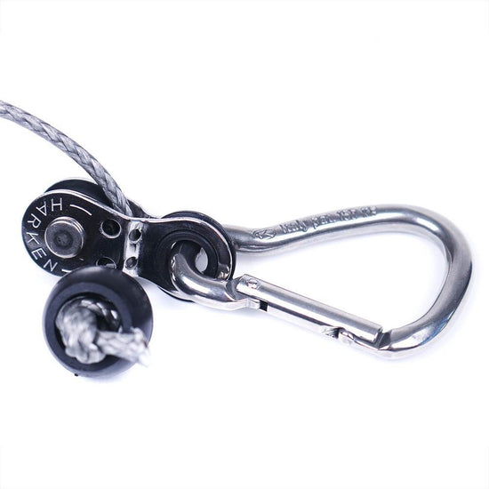 The Harken supplied thin 2mm grey/black flek rope that comes with the 18mm blocks is used to stop the front block from swinging away from the boom - see video (at time. 8.47mins)
