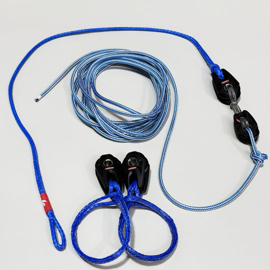 By adding second lower block onto a separate loop, our system keeps range to a maximum so you never run out of downhaul in strong winds.