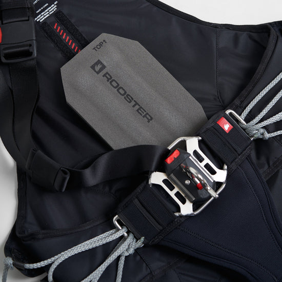 The pad has a soft layer, worn next to the body, and a harder dense layer which attaches to the harness with additional support from glass fiber battens sandwiched between the 2 layers, making it more comfortable.