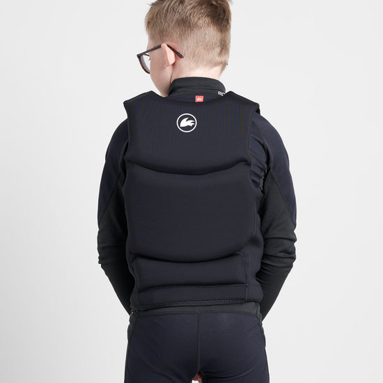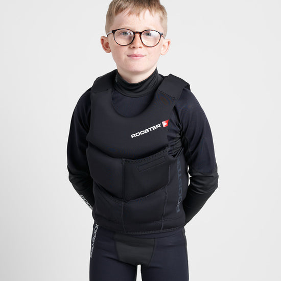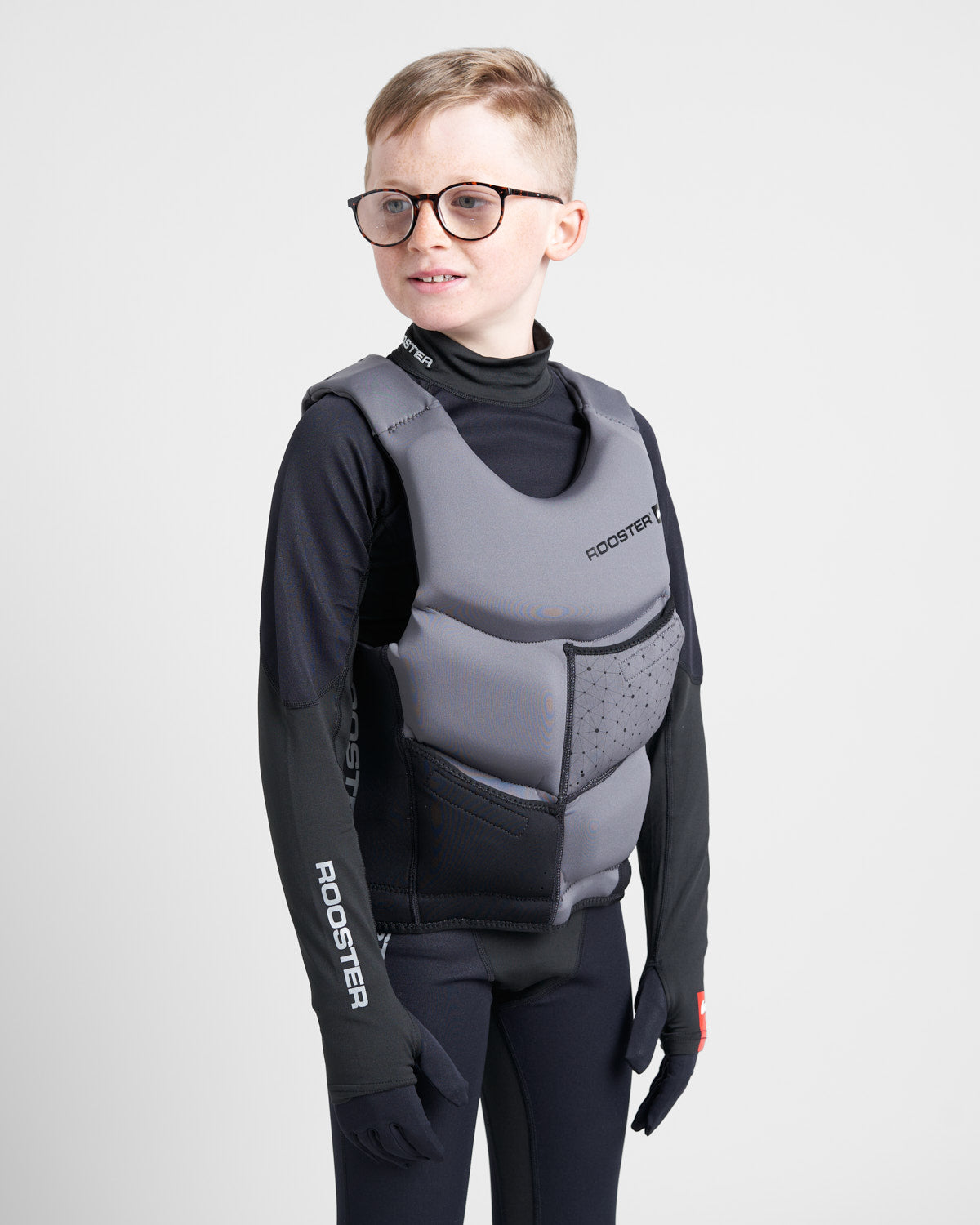 El Chaleco Salvavidas Junior Race Armour de Rooster® es una prenda técnica de perfil bajo fabricada en neopreno, diseñada específicamente para ajustarse de forma cómoda y segura al cuerpo de los regatistas más jóvenes. Con certificación CE 12402-5:2020, cumple con los requisitos de seguridad europeos para ayudas a la flotación, siendo una excelente opción para entrenamientos y regatas.