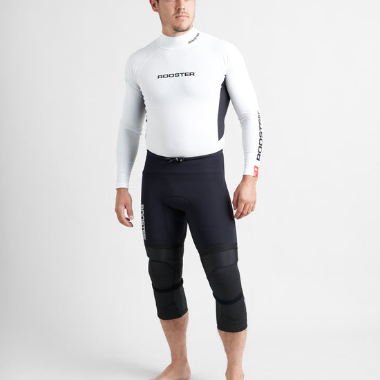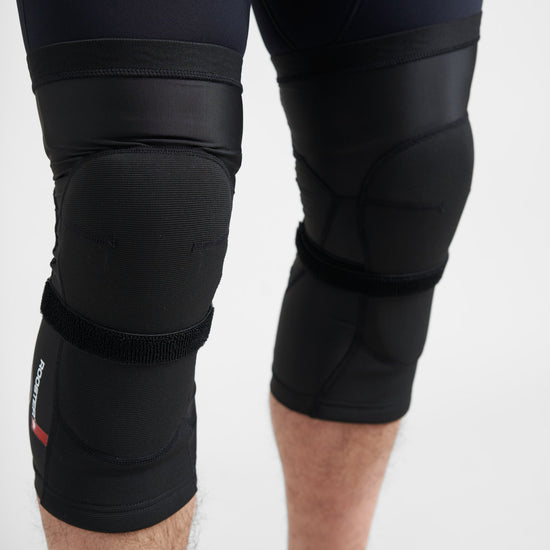 Long length knee pads that extend down to protect part of the shin. A streamlined fit with a silicon rubber elastic webbing strip at the top band and above the calf maintains the position of the knee pads, whilst an additional elastic strap is positioned just below the knee to further secure the pad in place. Comfort is enhanced through stretch panels around the main knee panel to allow stretch where you need it the most and improved movement, with a breathable mesh panel down the back to add breathability to the back of your leg. Durability and protection has been achieved to follow in our ‘Race Armour’ range, with the use of Duratex II at the outer surface and NBR rubber used on the inside – this has minimal water absorption so weight will not be added to the pads when wet, the properties of the rubber also mean that the pad will mould to your body slightly and also adds some shock absorption for those falls!
