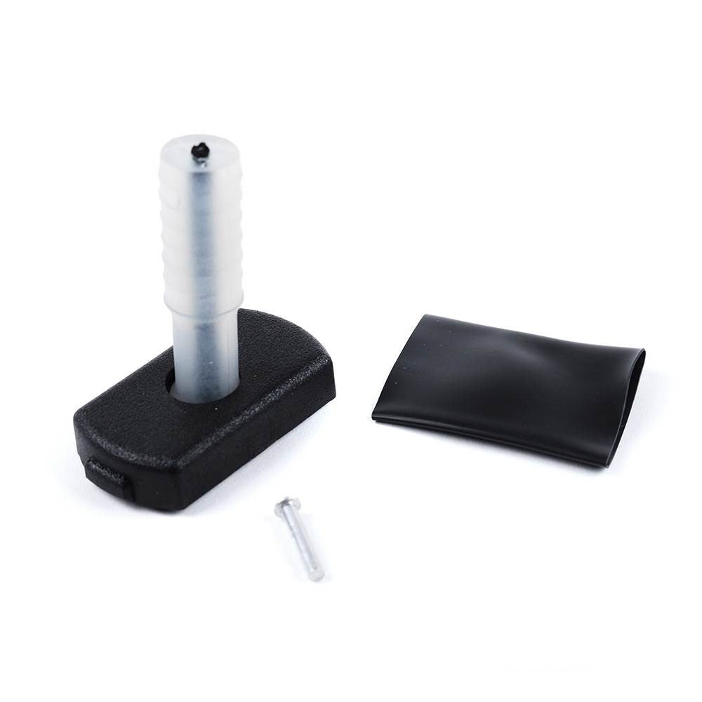 Releasable rubber joint/swivel is mounted with an aluminium pin only. The pin is kept in place by a piece of heat shrinkable tubing. To remove a joint: simply cut off the tubing and push the pin out.