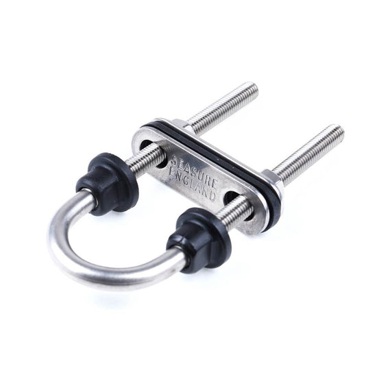 Seasure (part number 20.M5.50U) M5 Stainless steel U-bolt with 50mm thread length and plastic nuts on upper (low stress) side.