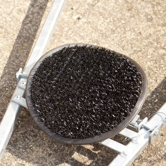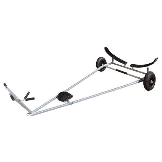 An A frame galvanised steel 4000 Trolley with dual astroturf cradles. The main cradle is set back on the trolley to help spread the load between the two cradles. The design would fit on an industry standard West Mersea geometry 250 road base.