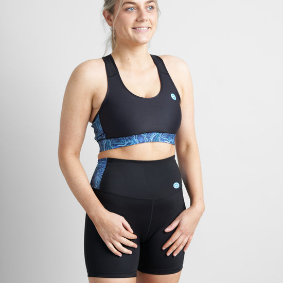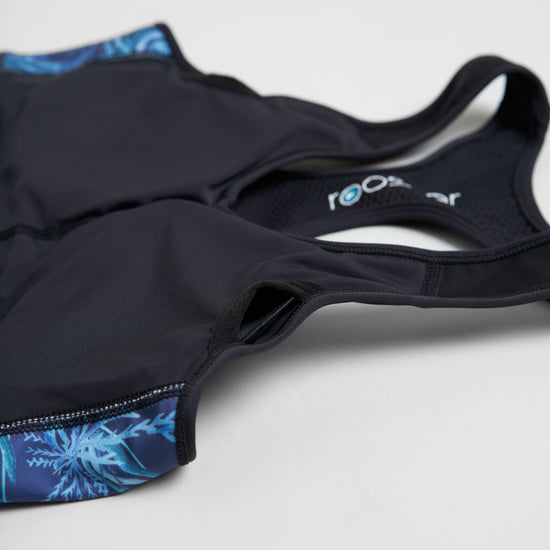 Medium Impact Sports Bra/Bikini top in signature Rooster Azure Womens styling. Double layered throughout for added support and a racer back made from mesh enhances breathability. Wide yet soft elastic chest band keeps top securely in place.